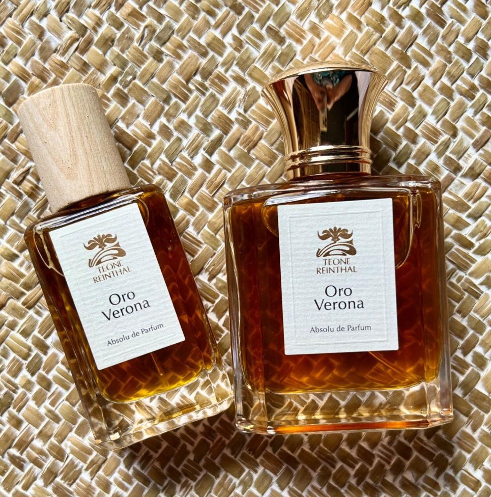 ORO VERONA (Verona Gold) features: Hand tinctured Murraya Paniculata (Orange Jessamine), Italian Bergamot, Rose otto, Jasmine Sambac, Italian Neroli, Nagarmotha, Santalum Osyris (African Sandalwood), Santalum spicatum (Australian), Santalum album (Indian), steam distilled Somali Frankincense Bosw. Carterii, CO2 Frankincense (B. Carterii), Cardamon, Tobacco, peated aged single malt whisky, Saffron, Orris, vanilla & AAA grade 5+ year aged Qadeem oud